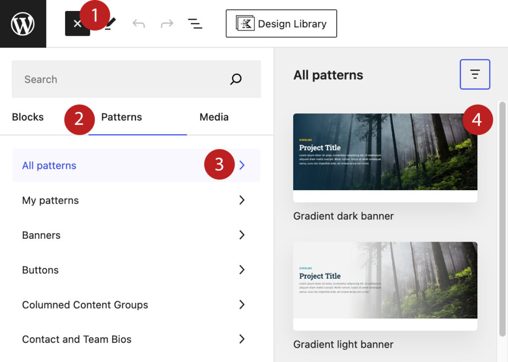 Patterns are reusable prestyled groups of blocks to use within your templates and page content. They are accessible via the block inserter menu (shown in the picture below). The Base Theme comes with a set of patterns you can use or you can add your own to the library.