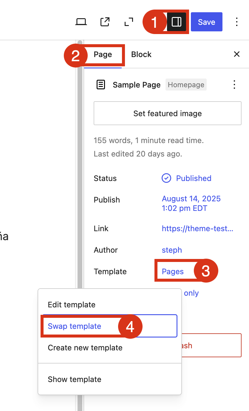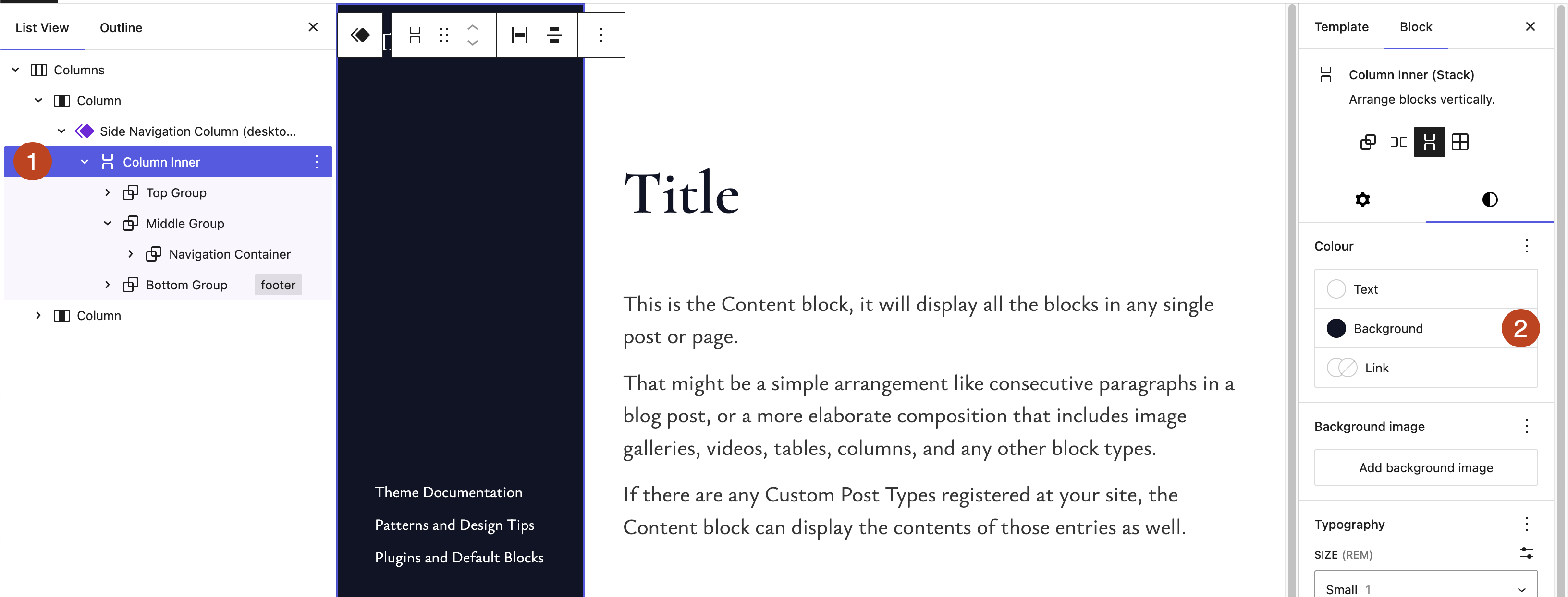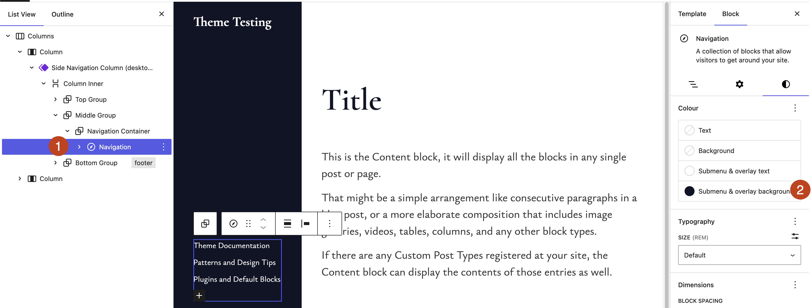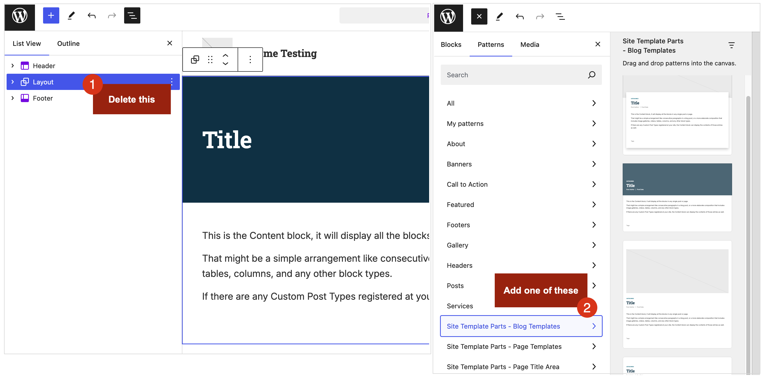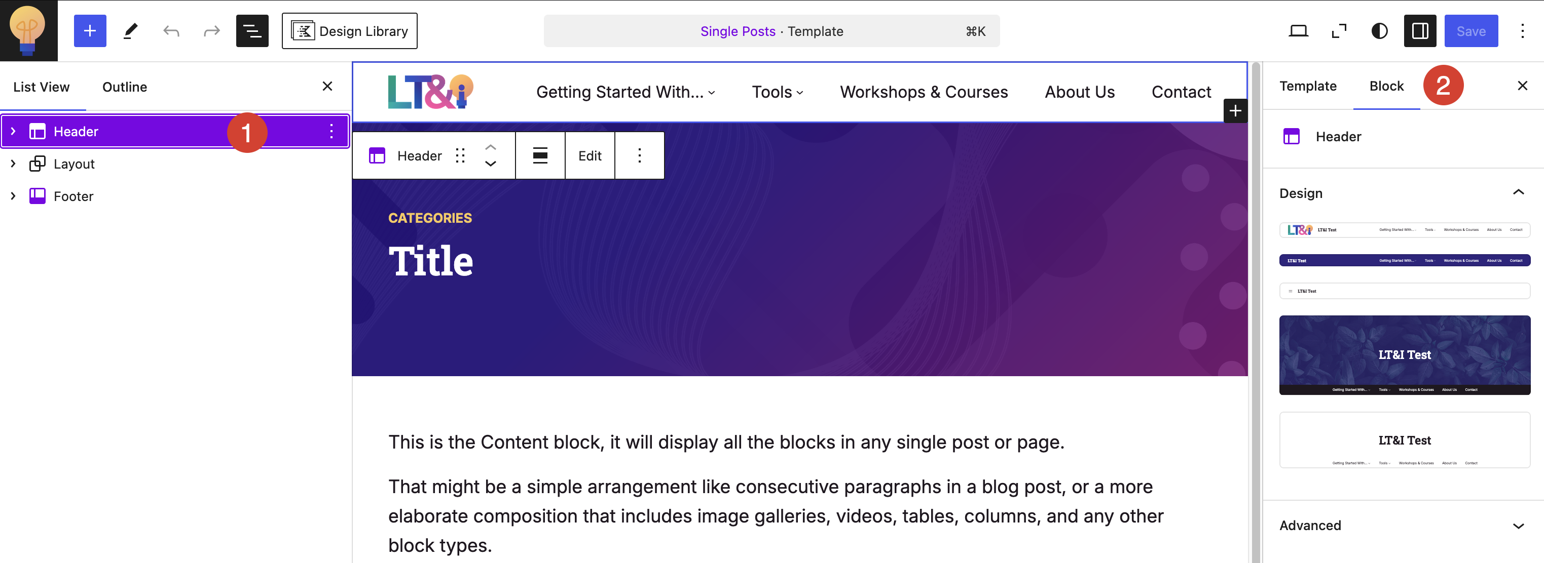 Tip: The theme’s headers and footers are special template parts in that you can quickly switch between your current one and another stored in the theme’s library via the block settings area of the site editor when you are editing a template. Just select the template part (1), and choose from one of the other options in the block settings panel on the right (2).