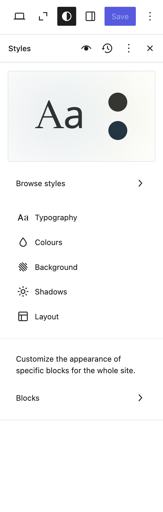 You can access this more comprehensive menu from any page in the site editor by clicking the half filled circle icon on the top right. From this menu, you can allows you to edit typography, colours, background, shadow presets, layout spacing settings, and block styles. Additionally, you can import your own fonts and add custom color palettes. Finally, from the second of the second of the 3 dot menus shown in the side bar, you can also access a CSS editor where you can apply additional styles to site content – it’s advised to use this sparingly and to keep a back up of the CSS file in case it accidentally gets cleared.