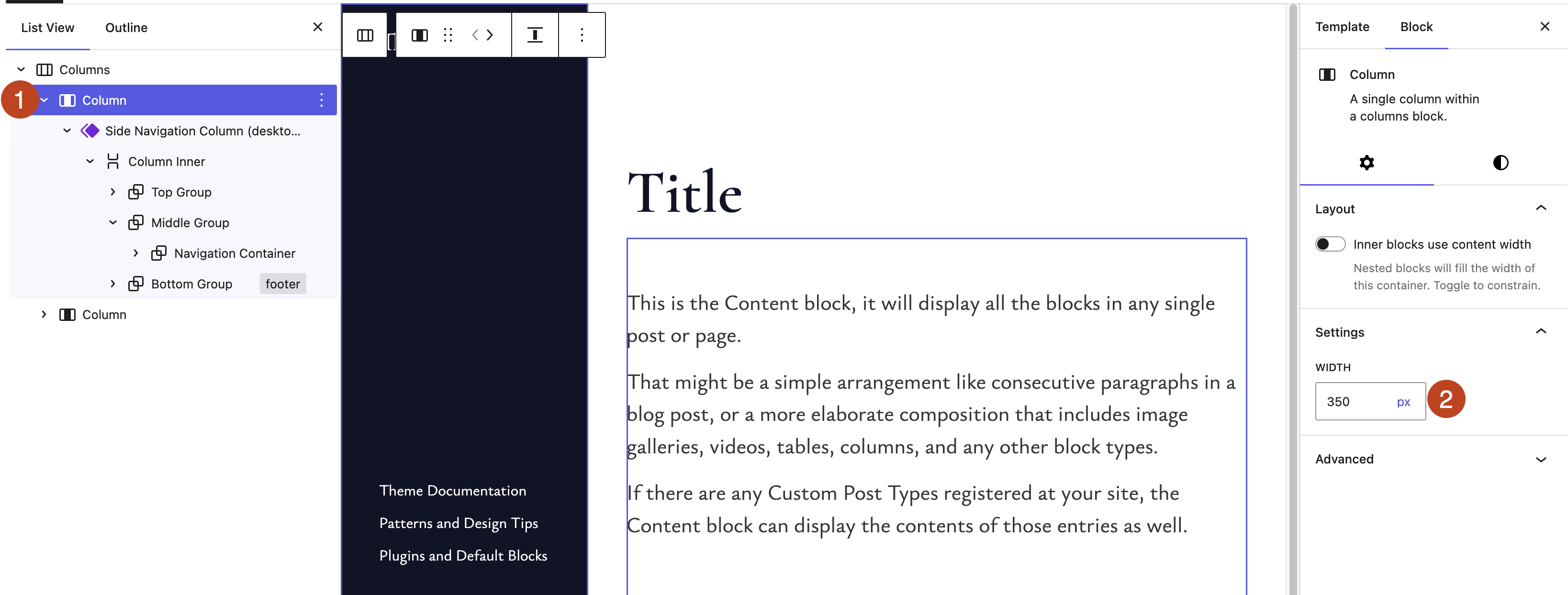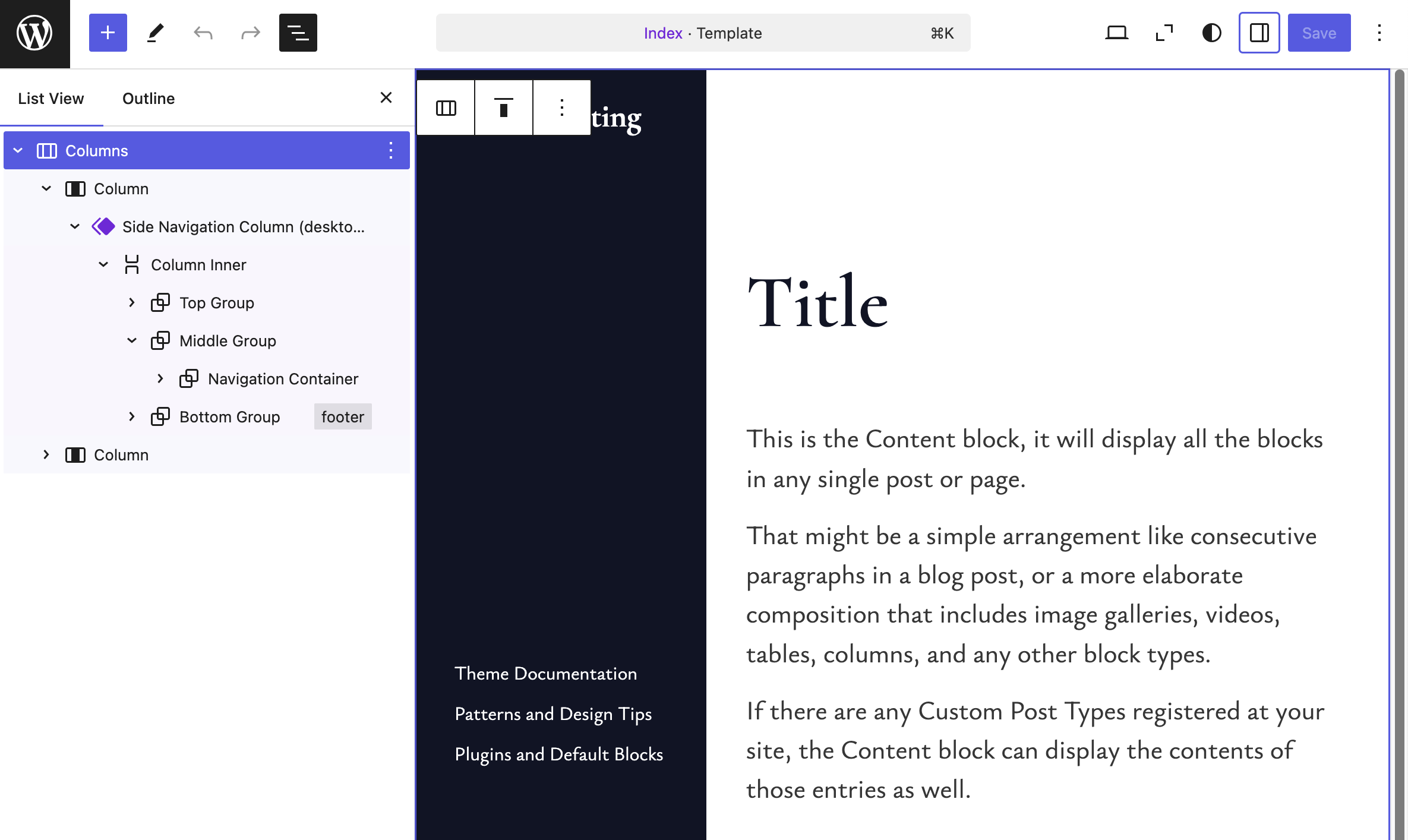 If you open the document overview panel (the 3 horizontal lines symbol) on a template in the sidebar theme, you will see the following block structure on the left side of your screen: